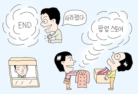 팝업 스토어(pop-up store)를 아시는지? 인터넷 홈페이지의 팝업창처럼 한시적으로 문을 열었다가 사라지는 점포를 말한다. 주로 트렌드에 민감한 소비자가 많이 모이는 곳에 1~2개월 정도만 오픈해 소비자의 관심과 체험을 유도한다. 현대백화점에서 미입점 브랜드를 위해 한시적으로 매장을 연 바 있으며, 신세계백화점은 컨테이너 트럭을 개조한 이동식 매장을 홍대입구, 가로수길 등을 수시로 오가며 열흘 남짓 운영할 예정이라고 한다. 적은 비용으로 신제품에 대한 소비자의 반응을 예측하거나 관심을 끄는 마케팅 수단으로 적격이다. 게릴라 스토어라고도 한다.