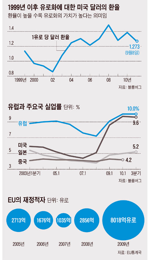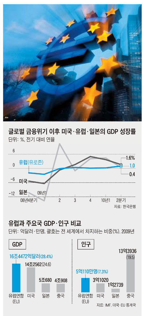 그러나 역사는 다시 심술을 부렸다. 지금 유럽의 하늘엔 먹구름이 잔뜩 끼었다. 글로벌 금융위기는 미국에서 시작됐지만, 충격은 유럽이 더 컸다. 2009년 미국 경제가 -2.6%의 마이너스 성장세를 보일 때 유로지역은 -4.1%로 한술 더 떴다. 부실 금융기관 처리와 경기 부양 측면에서 유럽이 한결 굼뜨고 소극적이었던 게 원인으로 지목된다. 2010년 들어서도 유럽의 상대적 부진은 계속됐다. 와중에 그리스와 이탈리아, 스페인 등 남유럽 국가들의 재정 위기가 터지면서 유럽 경제는 더욱 수렁 속으로 빠져들었다. 최근 유럽 은행들의 부실 문제가 다시 부각되면서 유럽발 세계 경제 위기가 오는 것 아니냐는 우려마저 낳고 있다.