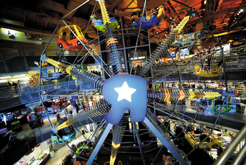 가드너 부사장은 인터뷰 도중 일어나 토이저러스 타임스스퀘어 매장을 안내했다. 입구에 들어서자마자 직원이 "상어, 상어요, 누구나 좋아하는 상어!"라고 외치며 상어 모양의 헬륨풍선을 무선 조종기로 움직이고 있었다. 영화 스파이더맨과 '스타워즈'의 다스베이더 복장을 한 직원들이 매장 안을 돌아다니며 아이들과 사진을 찍었다. 매장 한가운데 20m 높이로 솟은 회전 관람차 안에는 아이들이 타고 있고, 6m 크기의 주라기파크 공룡 모형과 실물 사이즈의 바비인형의 집도 눈에 들어왔다. 매장이라기보다 놀이공원에 가까운 풍경이었다.