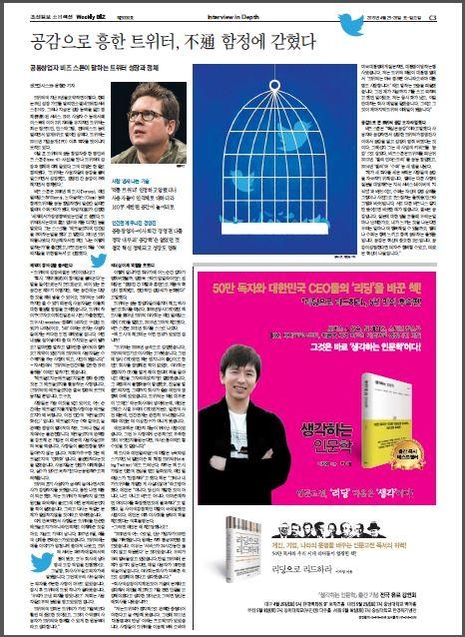 3면 기사는 트위터의 창업자 중 한 사람인 비즈 스톤과의 인터뷰였습니다.