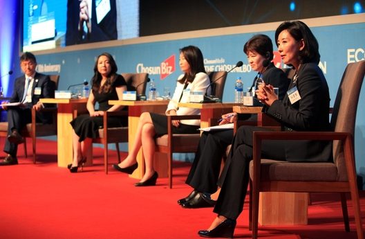 6일 서울 중구 소공동 더플라자호텔에서 열린 ‘위클리비즈 10주년 기념 경영·경영 글로벌 콘퍼런스’에서 로하나 로잔 아스트로 CEO, 에이미 김 맥킨지앤컴퍼니 시니어 파트너, 강은희 여성가족부 장관, 나경원 새누리당 국회의원은 ‘위미노믹스: 희망 대한민국, 유리천장 깨뜨리는 비밀노트’라는 주제로 대담을 나눴다.